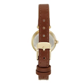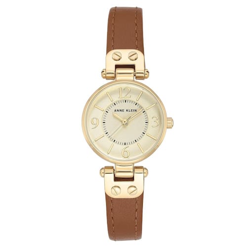 Relógio feminino Anne Klein 109442CHHY em tom de champanhe dourado e pulseira de couro marrom - Caixa dourada de 1 polegada de largura com lente de cristal mineral - Mostrador em champanhe com ponteiros dourados e faixa de minutos interna impressa em preto - Pulseira cônica de couro marrom com fecho de fivela - Circunferência interna da faixa: 7,5 polegadas - Movimento de quartzo japonês com display analógico - Resistente à água até 30 metros (99 pés): em geral, com resiste a respingos ou breve imersão na água, mas não é adequado para nadar ou tomar banho