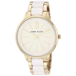 Anne Klein Relógio feminino com pulseira de resina, Marfim/Ouro, AK/1412IVGB - Relógio estilo namorado com marcadores finos de hora com logotipo impresso no mostrador central e elos centrais de resina marfim na pulseira - Caixa de metal de 37 mm com mostrador mineral - Movimento de quartzo japonês com mostrador analógico - Pulseira dourada e resina com fecho de joias - Resistente à água até 30 m: em geral, resiste a respingos ou breve imersão em água, mas não é adequado para nadar.