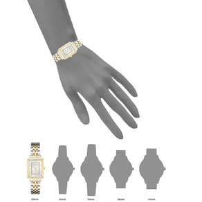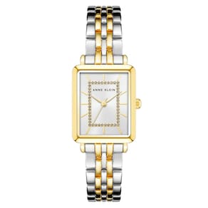 Anne Klein Relógio feminino com pulseira com detalhes em glitter, Dois tons, AK/3761SVTT - Lente de cristal mineral - Mostrador prateado com ponteiros e marcadores dourados; anel interno com glitter - Pulseira de elos ajustáveis em dois tons; fecho dobrável com botão duplo de segurança - Não é resistente à água