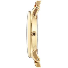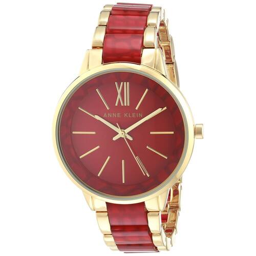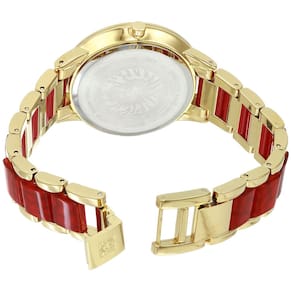 Relógio feminino com pulseira de resina Anne Klein — Lente de cristal mineral levemente abobadada — Mostrador vermelho brilhante com ponteiros e marcadores dourados — Pulseira dourada ajustável com elos centrais de resina estampada em crocodilo vermelho; fecho e extensor de joias — Resistente à água até 30 m (99 pés)