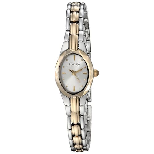 Relógio social feminino Armitron 75/3313SVTT em dois tons — Relógio oval com mostrador prateado com ponteiros e marcadores dourados — Caixa de latão de 19 mm com mostrador mineral — Movimento de quartzo com display analógico — Pulseira bicolor com fecho de joalheria — Não é resistente à água — Sutil e luxuoso, este lindo relógio é um ótimo complemento para qualquer coleção feminina.