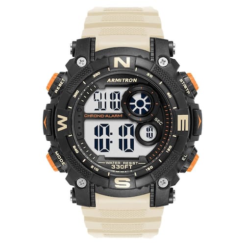 Relógio de pulseira de resina bege com cronógrafo digital unissex Armitron Sport, 40/8284BBE — Estojo de resina preta com anel superior texturizado — Display LCD com hora, segundos, dia e data — As funções incluem: cronógrafo, hora da volta, alarme, horário duplo, horário militar e luz de fundo — Pulseira de resina bege; fecho de fivela de aço inoxidável — Resistente à água até 330 pés (100 m)