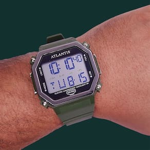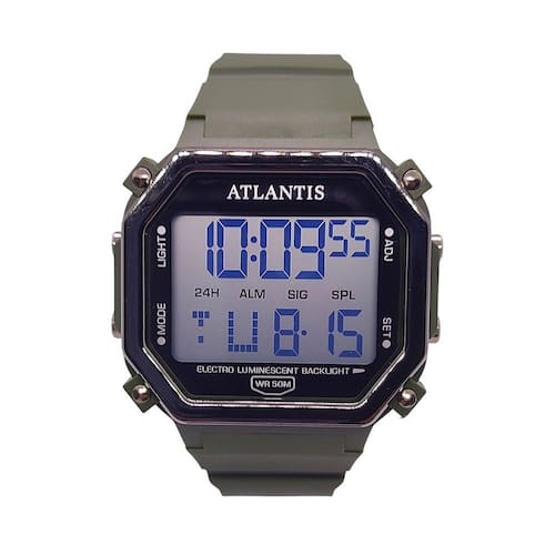 ESPECIFICAÇÕES DO RELÓGIO DE PULSO ATLANTIS A8070 ESPORTIVO DIGITAL BORRACHA MASCULINO QUADRADO RESISTENTE À ÁGUA: MARCA: Atlantis MODELO: A8070/Atlantis autêntico/Masculino/Digital/Prático/Moderno/Elegante/Casual/Prático GÊNERO: Masculino COR DA CAIXA: Preto, Verde ou Azul COR DO MOSTRADOR: Fundo Claro ou Escuro Negativo MATERIAL DA PULSEIRA: Borracha MATERIAL DA CAIXA: Resina MODELO DO FECHO: Fivela TIPO DE MOVIMENTO: Bateria TIPO DE VIDRO: Acrilico TAMANHO DA CAIXA INCLUÍDO A COROA: 46mm É RESISTENTE À ÁGUA? Sim É ADEQUADO PARA MERGULHO? Não PROFUNDIDADE DE RESISTÊNCIA À ÁGUA: 50 Metros