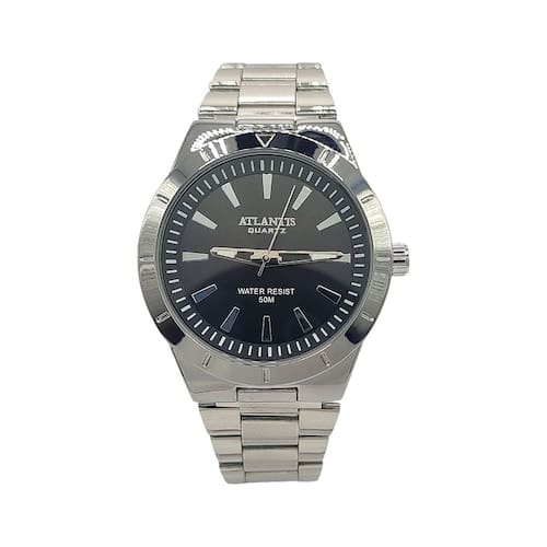ESPECIFICAÇÕES DO RELÓGIO DE PULSO ATLANTIS SOCIAL PRATEADO MASCULINO RESISTENTE À ÁGUA: MARCA: Atlantis Sports MODELO: G3392/Atlantis autêntico/Masculino/Analógico/Social/Prático/Moderno/ GÊNERO: Masculino COR DA CAIXA: Prateado com detalhe Preto COR DO RELÓGIO: Prata COR DO MOSTRADOR: Preto ou Prata MATERIAL DA PULSEIRA: Metal MATERIAL DA CAIXA: Metal MODELO DO FECHO: Fivela Dobrável TIPO DE MOVIMENTO: Bateria TIPO DE VIDRO: Vidro Mineral TAMANHO DA CAIXA INCLUÍDO A COROA: 46mm ESPESSURA: 1cm É RESISTENTE À ÁGUA? Sim É ADEQUADO PARA MERGULHO? Não PROFUNDIDADE DE RESISTÊNCIA À ÁGUA: 50 Metros