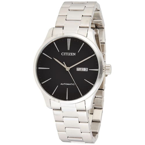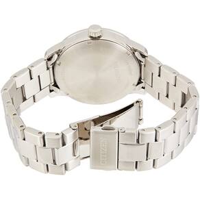 Caixa em aço inoxidável prateado com pulseira em aço inoxidável prateado.