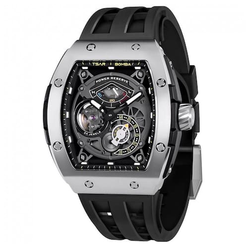 O relógio automático TSAR BOMBA TB 8210 é uma obra-prima da relojoaria mecânica que alia alta qualidade e artesanato refinado. Seu design skeletonizado revela a complexidade do movimento mecânico, expondo a beleza da arte horológica. O mostrador apresenta um indicador de reserva de energia às 12 horas, similar ao medidor de combustível de um carro: quando o ponteiro alcança a zona vermelha, indica que é necessário realizar a corda manual para armazenar energia. A caixa é confeccionada em aço inoxidável 316L, conhecido por sua alta resistência à corrosão e toque agradável, sendo seguro para a pele. O cristal é de safira sintética, com dureza excepcional de até 1600HV, garantindo proteção contra riscos no uso diário. A pulseira colorida de fluoroelastômero é resistente ao suor, respirável e durável, promovendo conforto prolongado durante o uso. Com resistência à água de até 50 metros, este relógio suporta transpiração, chuva e respingos acidentais, embora não seja recomendado ajustar a coroa submerso ou usar em ambientes com água quente, como sauna ou banhos. Seu sistema luminoso avançado permite a visão clara das horas no escuro sem incomodar os olhos. Equipado com um renomado movimento japonês de corda automática, o TSAR BOMBA TB 8210 oferece precisão e estabilidade, assegurando que você não perca compromissos importantes. Seu design elegante e diferenciado agrega sofisticação e destaque em qualquer evento.