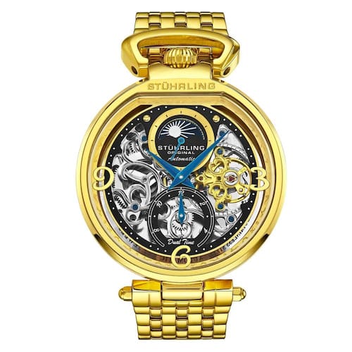 O Relogio Automatico Modena 4032 com Mostrador Preto e Pulseira em Aco Inoxidavel Dourada da Stuhrling e um modelo de alta qualidade que combina estilo e funcionalidade. Com um design esqueletizado, este relogio apresenta um mostrador impressionante que revela a complexa mecanica interna do relogio. Alem disso, a funcionalidade de hora dupla permite que o usuario rastreie facilmente dois fusos horarios, enquanto o indicador diurno e noturno oferece maior conveniencia e estilo. O fundo da caixa de exposicao mostra o movimento mecanico do relogio, proporcionando uma experiencia de cronometragem perfeita. Construido em aco inoxidavel com fivela implantavel, este relogio oferece conforto e ajuste seguro. E a escolha perfeita para o homem exigente que procura um relogio elegante e pratico. Dimensoes da embalagem 10,67 cm x 8,64 cm x 7,62 cm Fabricante St hrling Numero do modelo 4032.2 Numero da peca 4032.2 Peso do item 454 gramas Marca: Não Informado