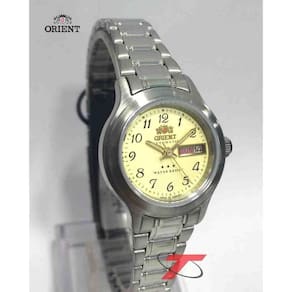 ESPECIFICAÇÕES TÉCNICAS - Marca: Orient - Gênero: Feminino - Tipo de mostrador: Analógico - Função: Calendário com dia do mês e semana - Tipo de fecho: Dobrável com trava por pressão - Cor da caixa: Prata - Cor do mostrador: Bege - Cor da pulseira: Prata - Material da caixa: Aço inox - Material da pulseira: Aço inox - Largura da caixa: 2,7 cm - Espessura da caixa: 1,1 cm - Resistência à água: 3 ATM 30 m - Garantia: 12 meses