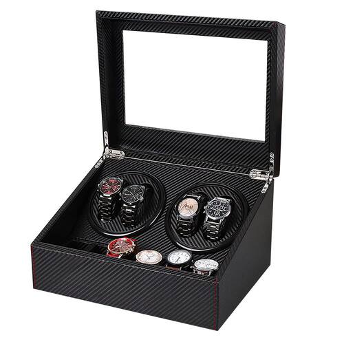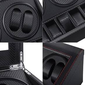 Enrolador automático de relógio com 4 telas de enrolamento de relógio com motor silencioso e 6 travesseiros de relógio flexíveis Estojo de armazenamento de couro de fibra de luxo para relógios masculinos/femininos - Adaptador AC - ?. ?Material premium?? Enrolador de relógio com couro moderno de fibra de carbono. O interior macio foi aplicado para proteger seu relógio e evitar arranhões. Este enrolador de relógio tem 4 enroladores e 6 espaços de armazenamento, o que oferece máxima flexibilidade para armazenar todas as suas peças de relógio atemporais. - ?. ?Almofadas flexíveis?? A caixa enroladora de relógios vem com travesseiros flexíveis adequados para relógios automáticos femininos e masculinos. Você pode encaixar seu relógio no travesseiro horizontal ou verticalmente de acordo com o tamanho da pulseira. É adequada para pulseiras de relógio com alcance de 6,9 “a 7,9". (ao colocar dois relógios lado a lado no mesmo motor, o diâmetro dos relógios precisa ser menor ou igual a 36 mm/1,42 polegadas) - ?. ?Motor extremamente silencioso?? Enrolador automático de relógio usando motor atualizado, cujo ruído é de até 10 db, nunca o perturba em um local silencioso e prolonga a vida útil do relógio. Alimentado por adaptador AC (incluído). (Voltagem: 100-240 V, 50/60 HZ, 0,2 A); - ?. ?Fácil de usar?? Alterna os modos de rotação no sentido horário e anti-horário. Duplica o design do interruptor, que pode controlar os 2 rotores separadamente. Basta pressionar o botão para ligar/desligar o enrolador do relógio. Ele gira no sentido horário por 2 minutos, descansa por 6; retoma no sentido anti-horário por 2 minutos, descansa por 6 e repete. - ?. ?Um presente perfeito?? O enrolador mecânico de relógios é uma caixa de coleção de relógios requintada. Um presente perfeito para sua família, amigos ou parceiros de negócios no aniversário, Dia de Ação de Graças, Natal, Dia dos Namorados, aniversário ou dia de comemoração.