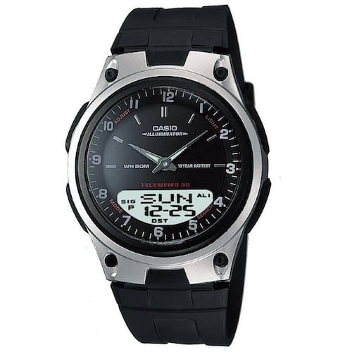 Iluminação de diodo Cronômetro 24 horas Timer regressivo 24 horas 3 alarmes Snooze, toca em pouco tempo depois do alarme Bateria de dez anos 12 horas/ 24 horas Aprova dágua 50 metros Vidro esférico Pulseira de borracha
