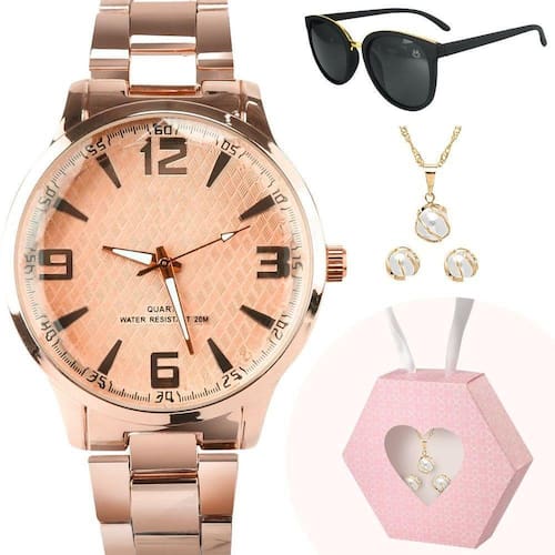 Relogio Banhado Dourado + Oculos Proteção Uv + Colar Caixa Adicione um toque de elegância e sofisticação ao seu visual com este Conjunto Elegante de Acessórios Banhados a Ouro. Este kit inclui: - 1 Relógio Analógico Feminino Banhado a Ouro, à Prova D\'água, em Aço Inoxidável, garantindo durabilidade e estilo em todas as ocasiões.