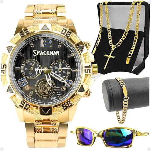 Relogio Banhado Masculino + Oculos Sol + Cordão Casual Religioso Presente Proteção Uv Ouro Kit Presente Masculino Orizom Spaceman - Relógio Analógico + Corrente + Pingente + Pulseira + Óculos de Sol Este kit masculino exclusivo da Orizom Spaceman é a combinação perfeita de requinte, estilo e excelência. O conjunto inclui: