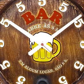 Relógio Barril decorativo BAR. Seu miolo com os dizeres: BAR abre às 5h - Em algum lugar são 5h - e tem seus marcadores apenas com os números 5, além do caneco de Chopp amarelo no meio. O Relógio Barril decorativo é confeccionado em fibra de vidro, simula de forma realista a tampa de um barril de madeira de carvalho com um relógio. Uma peça funcional e muito bonita. Ideal para decoração de bares, churrasqueiras, espaço Gourmet, salão de festas e decoração em casa. Tem o diâmetro de 42 cm de diâmetro por 7 de altura. Essa peça é para ser pendurada na parede. Produzida artesanalmente, uma a uma é pintada nos mínimos detalhes à mão com tintas de alta qualidade e cores vibrante. Máquina do relógio com a qualidade Quatz. O resultado é um presente de indiscutível qualidade e único ideal para homens. Peça colecionável e decorativa. Decore com estilo e bom gosto ambientes como estúdios, barzinhos, restaurantes, salas e churrasqueiras. É um verdadeiro presente para ser lembrado! Ean: 7898574060413