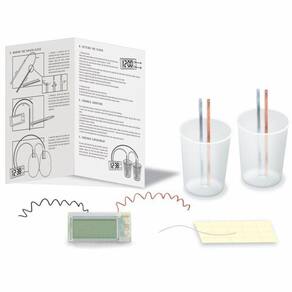 Contém relógio digital com fios, potes, fio para conexão, fitas transparentes, tiras de cobre e de zinco e instruções detalhadas.
