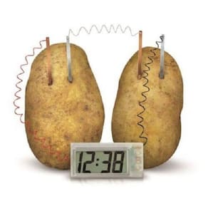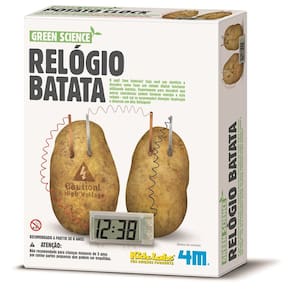 Descubra como funciona um relógio sem pilhas ou baterias. Seja você um cientista e descubra como fazer um relógio digital funcionar utilizando batatas. As placas de metal e as batatas fazem uma simples bateria que gera a eletricidade para o relógio funcionar. Cada batata funciona como um dispositivo chamado célula eletroquímica. Ele converte a energia química armazenada nas tiras de metal em energia elétrica. Duas batatas são necessárias para produzir eletricidade forte o suficiente para abastecer o relógio. A bateria funciona por causa das propriedades químicas dos metais no interior neste caso, o cobre e o zinco . As propriedades diferentes fazem com que minúsculas partículas carregadas de eletricidade chamados íons se desloquem entre as duas chapas de metal. Este fluxo é uma corrente elétrica. A batata contém partículas que permitem o fluxo de corrente. A corrente elétrica também flui ao longo dos fios entre as placas de zinco, de cobre e do relógio. Essa corrente faz com que o relógio funcione. Outros experimentos: Ponha um pouco de refrigerante nos potes fornecidos. Insira as placas de cobre e de zinco nos potes, Siga as instruções do manual , tomando cuidado para que as placas de metal não se toquem. O relógio deve agora começar a funcionar. Você pode experimentar com diferentes líquidos como água salgada, sucos de frutas, ou frutas como limão, laranja, tomate, etc. A diversão é ilimitada. Experimente para descobrir que outras substâncias podem fornecer energia a este relógio. Você vai se surpreender. Atenção: Inspiração e diversão em alta voltagem Especificações: Marca: 4M - Idade Recomendada: +8 anos. Itens inclusos: Relógio digital com fios, potes, fio para conexão, fitas transparentes, tiras de cobre e de zinco e instruções detalhadas. Dimensões aproximadas da caixa: 17 x 22 x 6 cm. ATENÇÃO: Observe atentamente a idade recomendada para o brinquedo. Pode conter partes pequenas que podem ser engolidas e perigosas. As fotos são para ilustrar o produto. Certificado INMETRO CE-BRI-INTERTEK-I 00124-19 NM 300/2004. Código do produto: K00-03275. Código de barras EAN: 4893156032751 Marca: Kidzlabs Ean: 4893156032751