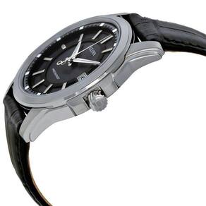 Em aço inoxidável com mostrador cinza carvão com padrão espiralado de várias camadas, ponteiro dos segundos em movimento contínuo em prata, ponteiros luminosos para as horas e minutos, marcadores facetados com quadrados luminosos, calendário e pulseira de couro preta.