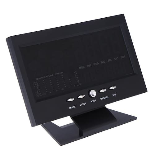 caracteristicas: - display colorido - mede temperatura e celsius e fahrenheit - mede umidade relativa do ar - registra temperatura e umidade minima e maxima - relogio no formato 12 ou 24 horas - calendario no formato data, mes e dia da semana em ingles - alarme despertador com funcao soneca - controle de voz, luz de fundo. - pode ser instalado em cima de moveis ou em parede