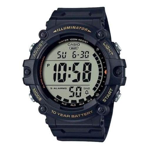 Outros: Repetição automática - Alarme/sinal de hora em hora - 5 alarmes multifuncionais (com 1 alarme soneca) - Luz de fundo LED Afterglow - Cor clara / LED: Âmbar - Calendário automático completo (até o ano 2099) - Precisão: ± 30 segundos por mês - Formato de 12/24 horas - Horário regular: Hora, minuto, segundo, pm, mês, data, diaar - Vidro de resina - Tamanho da caixa (L× W× H): 54,4 × 51,3 × 15,8 milímetros - Peso: 61g - Material da caixa / moldura: Resina - Pulseira em resina - Resistência à água: 100 metros de resistência à água - Fonte de alimentação e vida útil da bateria - Vida útil da bateria: 10 anos no CR2032 (aproximadamente)