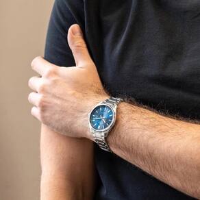 O destaque fica por conta do mostrador azul, que adiciona um toque moderno ao relógio, mantendo ótima legibilidade. O vidro mineral protege o mostrador, enquanto a resistência à água de 10 bar (100 metros) permite uso tranquilo em situações cotidianas e contato moderado com água. O modelo conta ainda com visor de data, agregando funcionalidade ao conjunto.