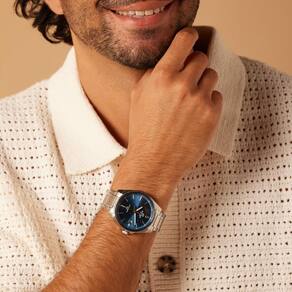 A caixa em aço inoxidável possui dimensões de 46,5 42,6 9 mm, com perfil fino que se ajusta bem ao pulso. Seu peso de 113 g garante uso confortável ao longo do dia. A pulseira também em aço inoxidável conta com fecho de dobrar em três com um só toque, proporcionando praticidade e segurança.