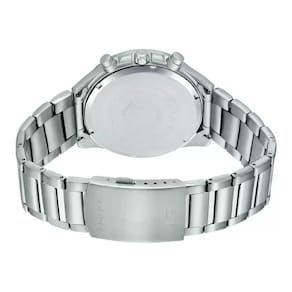 Funções: Visor de data / Cronômetro de 1/10 segundos / Horário regular Analógico: 3 ponteiros (hora, minuto e segundos), 3 mostradores (segundos, minutos e segundos do cronômetro) / Precisão: 20 segundos por mês