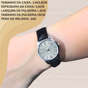 Especificações: Pulseira em Couro Vidro mineral Resistente a água Horário regular Analógico: 3 ponteiros (hora, minuto, segundo) Precisão: ±20 segundos por mês Duração aprox. da bateria: 3 anos com SR626SW