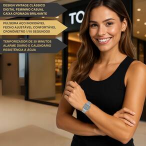 Ficha Técnica Marca: Casio Modelo: LA670WEM-7DF Mecanismo: Digital a quartzo Material da caixa: Resina cromada Material da pulseira: Aço inoxidável (malha) Fecho: Ajustável de pressão Resistência à água: Sim (uso diário leve) Tipo de vidro: Resina Formato da caixa: Retangular Gênero: Feminino Estilo: Vintage / Casual Funções: Cronômetro 1/10 s, temporizador, alarme diário, sinal horário, calendário automático, hora/minuto/segundo, mês, data e dia Precisão: ±30 segundos/mês Duração aproximada da bateria: 2 anos (CR1216)