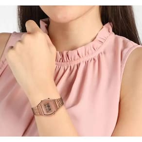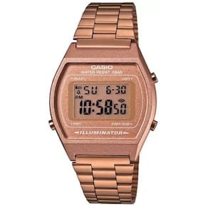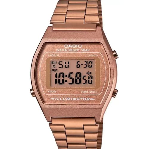Especificações Relógio CASIO Vintage B640WC-5ADF: - Digital - Iluminação noturna - Cronógrafo: cronômetro progressivo 1/100 segundos com capacidade 59':59.99" - Alarme diário - Bip hora cheia (sign/chime) - Formato 12/24hs - Sistema de energia: Bateria Lithium 3V - Tampa posterior: Parafusada - Resistência à água: Superficial - Vidro: Acrílico - Material da caixa: Resina com acabamento ouro rosê - Material da pulseira: Aço Inox com acabamento ouro rosê - Diâmetro da caixa: 38,9mm x 35mm - Espessura da caixa: 9,4mm - Manual em Português