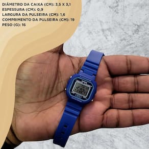 Medidas Tamanho da caixa: 3,5 x 3,1 cm Altura da caixa: 0,9 cm Largura da pulseira: 1,6 cm Comprimento da pulseira: 19 cm Peso do relógio: 16 g