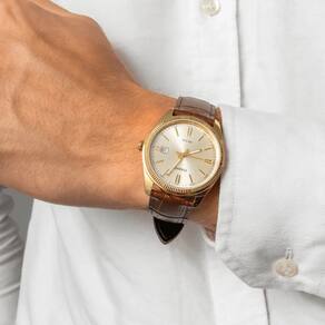 Características Formato do Relógio: Redondo Composição do Vidro: Cristal mineral Material da Caixa: Aço Inox Cor da Caixa: Dourado Cor do mostrador: Dourado Material da Pulseira: Couro Cor da Pulseira: Marrom Mecanismo: Analógico Quartz
