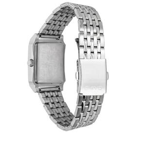 Características Formato do Relógio: Retangular Composição do Vidro: Cristal mineral Material da Caixa: Aço Inox Cor da Caixa: Prata Cor do mostrador: Preto Material da Pulseira: Aço inox Cor da Pulseira: Prata Mecanismo: Analógico Quartz