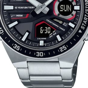 Relógio Casio Masculino Edifice EFV-C110D-1A4VDF Cor da correia: Prateado Características: Liberte-se para ter foco na vida. Use uma combinação de relógio analógico-digital com uma bateria de 10 anos com a qual você não terá que se preocupar por muito tempo. O design do mostrador oferece maior profundidade e dimensionalidade para um visual dinâmico e esportivo. O mostrador interno digital oferece diversas funções, incluindo hora mundial, cronômetro de 1/100 de segundo e cronômetro de contagem regressiva. Especificações: Marca: Casio Modelo: EFV-C110D-1A4VDF Tipo de relógio: Analógico e Digital Gênero: Masculino Estilo: Casual Calendário: Sim Cronômetro: Sim Alarme: Sim Luz: Sim Resistência à água: Sim - 10 ATM = 100 metros Tipo de fecho: Material da Caixa: Aço Inoxidável Material da Pulseira: Aço Inoxidável Características do vidro: Vidro Mineral Tamanho da caixa C L A : 51.3 46.9 13.7 mm Peso do produto: 166 Gramas Cor da pulseira: Prateado Cor da caixa: Prateado Alimentação: Bateria Conteúdo da Embalagem: Relógio, caixa, , certificado de e manual de instruções do Fabricante: 12 meses Fornecedor: Casio