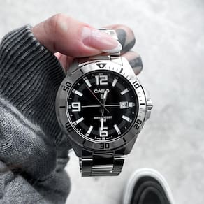 Faça uma declaração impressionante de confiança com um relógio analógico metálico de impacto único com caixa grande e marcas de índice arrojadas. A exibição da data de fácil leitura na posição das 3 horas adiciona um toque extra prático. Graças à resistência à água de até 50 metros, você não precisa se preocupar nem em dias chuvosos