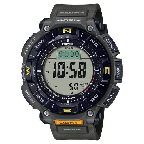 A linha pro trek de equipamento autêntico para o exterior destinado aos amantes da natureza apresenta o prg-340, um relógio que incorpora bioplásticos ecológicos, enquanto proporciona o mesmo ajuste confortável para o seu pulso. A caixa e a bracelete de uretano são fabricadas a partir de bioplásticos feitos com óleo de rícino e a bracelete de bioplásticos feitos com milho. O lcd duplex define camadas separadas para os gráficos da bússola e as funções do relógio, permitindo uma visualização maior da bússola para uma melhor legibilidade e navegação mais fácil num design tanto funcional quanto bonito.