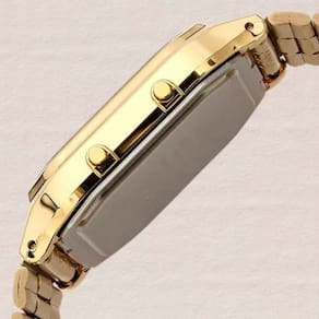 Especificações: Material do corpo/anel: resina Material do corpo/anel: Resina / Dourado Pulseira de Aço Inoxidável Tipo de Fecho: Gancho Vidro com resina Resistente a água Hora dupla Cronômetros de 1/100 de segundo Capacidade de medição: 5959.99" Modo de medição: tempo transcorrido Alarme diário Sinalização a cada hora Calendário automático (fevereiro com 28 dias) Formatos de 12/24 horas Horário regular Analógico: 2 ponteiros (hora, minuto) Digitais: hora, minutos, segundos, am/pm (pós-meridiano), mês, data, dia Precisão: ±30 segundos por mês Aprox. da bateria: 3 anos com SR920W