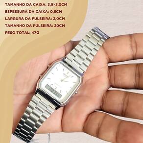 O clássico que nunca sai de moda! Com design retrô e recursos modernos, este relógio oferece cronômetro, alarme e hora dupla em um estilo casual e resistente à água. Ideal para quem busca funcionalidade e elegância em um único acessório!