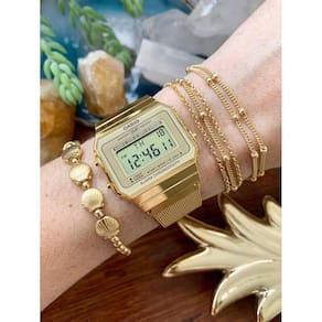 Relógio Casio Vintage A700Wmg-9Adf O Relógio é um dos acessórios mais presentes em todas as fases da nossa vida, mesmo com inúmeros dispositivos modernos que mostram as horas, o clássico relógio para pulso não perdeu seu charme e é uma ótima opção para complementar o visual. O Relógio Casio Vintage A700Wmg-9Adf é perfeito para uso pessoal ou para presentear alguém especial em uma data comemorativa, sendo um presente único, de ótimo gosto, elegância e muita praticidade. Produzido com materiais resistentes e de qualidade, a peça reúne sofisticação e estilo em um único item. A escolha perfeita para quem gosta de ter um acessório que complemente o look em qualquer ocasião. Especificações técnicas Relógio casio vintage a700wmg-9adf gênero: unissex mecanismo: digital alimentação: bateria composição do vidro: cristal mineral material da caixa: aço inoxidável pulseira dourado ionizada estojo dourado com galvanização por íons resistência à água: 3 atm – 30 mts. espessura da caixa: 37,4mm largura da caixa: 6mm -peso: 53g itens inclusos na caixa: relógio, manual de instruções, certificado de e . prazo de : 12 meses rede de autorizadas