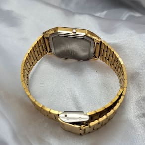 Características Formato do Relógio: Retangular Composição do Vidro: Cristal mineral Material da Caixa: Aço Inox Cor da Caixa: Dourado Cor do mostrador: Preto Material da Pulseira: Aço Inox Cor da Pulseira: Dourado Mecanismo: analógico Quartz