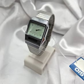 Características Formato do Relógio: Retangular Composição do Vidro: Cristal Mineral Material da Caixa: Resina Cor da Caixa: Prata Cor do mostrador: Verde Material da Pulseira: Aço Inox Cor da Pulseira: Prata Mecanismo: Analógico-Digital