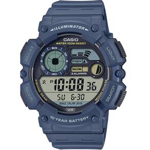 Máquina movida a bateria / quartz Mecanismo digital Caixa do relógio de resina azul Pulseira de resina / borracha azul Fivela de plástico Mostrador digital padrão números escuros e fundo claro Vidro de acrílico Relógio com calendário digital, cronômetros progressivo e regressivo, 3 alarmes multifuncionais 2 alarmes de uma vez e 1 soneca/alarme único ; tipo de alarme: alarme diário, alarme de data, alarme de 1 mês, alarme mensal, hora dupla e horário de verão, dados da lua idade da lua da data específica, gráfico de fases da lua , modo de pesca a adequação de uma data e hora específicas para a pesca é indicada como um dos quatro níveis. Formato de 12/24 horas Botões simples de pressão padrão sem rosca Tampa posterior parafusada Resistência à água 10atm 100m Itens inclusos na caixa: relógio, manual de instruções, certificado de garantia Garantia: 12 meses rede de autorizadas Ean: 4549526341977