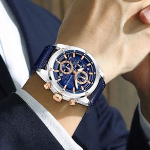 ? resistente à água ? importados: 30M (100FT) Resistentes à água, suporta respingos ou breve imersão na água, Perfeito para todo tipo de negócio, atividades casuais, internas e ao ar livre e uso diário, mas não são adequadas para natação ou chuveiro? ? multifunções: Movimento de quartzo multifunção de seis mãos, Sub-discagem de três cronógrafos, sub-discagem de segundos, sub-discagem de minutos, 24 horas Sub-discagem.? ? Luminosas : Mãos Luminosas , é conveniente para ler a hora no escuro? Gift Box ? : Hight Quality Gift Box - Bom presente para namorado, marido, pai, irmão, avô, amigos... Grande surpresa para aniversário, presente de negócios, Natal, Dia dos Namorados, Casamento, Ano Novo, Dia dos Pais