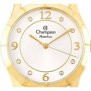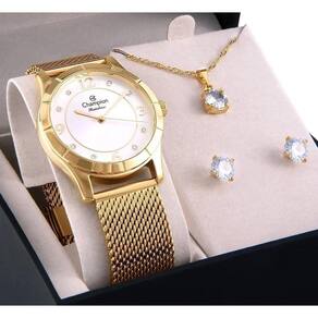 Relógio champion dourado feminino + colar e brincos cn29910w Relógio champion feminino dourado cn29910w acompanha colar e par de brincos folheados com cristais Características / funções: Relógio champion feminino cn29910wPulseira: aço douradoMostrador: prata com cristaisResistência: 5 atmVisor em cristal mineralMovimento quartzAcompanha colar e brincos Tamanho da caixa: 38 mmEspessura da caixa: 09 mmTamanho da pulseira: 20 cm Material da pulseira: aço inoxidávelCor da pulseira: douradaTipo de trava da pulseira: pressão