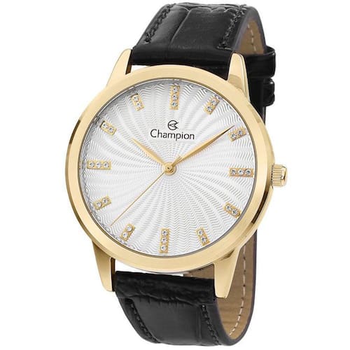 Características Formato do Relógio: Redondo Composição do Vidro: Cristal mineral Material da Caixa: Metal Cor da Caixa: dourado Cor do mostrador: branco Material da Pulseira: Couro Cor da Pulseira: preto Mecanismo: Analógico Quartz
