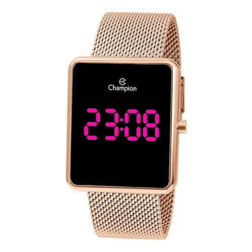 Relógio Champion Feminino Digital Led Casual Rose Gold CH40080HMarca: ChampionModelo: CH40080HTipo de mostrador: Digital Led VioletaMecanismo: QuartzoAlimentação: BateriaFormato da Caixa: QuadradoCor do mostrador: PretoCor da caixa: Rose GoldCor da pulseira: Rose GoldMaterial do Vidro: Cristal MineralMaterial da caixa: MetalMaterial da pulseira: AçoTipo de Fecho: GanchoNível de Resistência à Água: 30 MTCalendário: SimCronômetro: NãoAlarme: NãoLuz noturna: Não Medidas:Tamanho da Caixa: 3,6x4,4cmEspessura da Caixa: 1,0cmLargura da Pulseira: 2,4cmTamanho da Pulseira: 21cmPeso do Relógio: 132gConteúdo da Embalagem:Estojo da marcaAcessórios da marca (correspondentes a cada modelo)Manual em PortuguêsCertificado de Garantia do FabricanteNota Fiscal Eletrônica Fornecedor: Magnum Indústria da Amazônia SA. CNPJ: 63.715.510/0001-65Garantia: Garantia de 1 Ano com o Fornecedor
