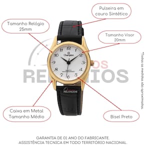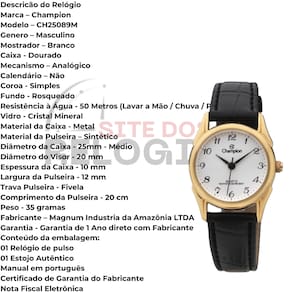 Descricão do Relógio Marca – Champion Modelo – CH25089M Genero – Masculino Mostrador – Branco Caixa - Dourado Mecanismo – Analógico Calendário – Não Coroa - Simples Fundo - Rosqueado Resistência à Água - 50 Metros (Lavar a Mão / Chuva / Piscina) Vidro - Cristal Mineral Material da Caixa - Metal Material da Pulseira – Couro Diâmetro da Caixa - 25mm - Médio Diâmetro do Visor - 20 mm Espessura da Caixa - 10 mm Largura da Pulseira - 12 mm Trava Pulseira - Fivela Comprimento da Pulseira - 20 cm Peso - 35 gramas Fabricante – Magnum Industria da Amazônia LTDA Garantia - Garantia de 1 Ano direto com Fabricante Conteúdo da embalagem: 01 Relógio de pulso 01 Estojo Autêntico Manual em português Certificado de Garantia do Fabricante procedência garantida Eletrônica