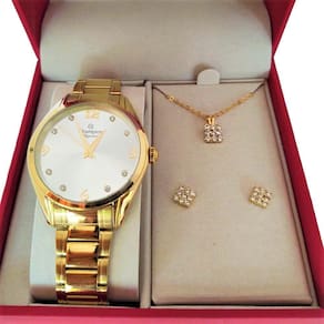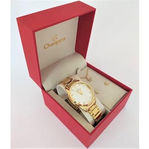 Compre o Relógio Champion Feminino Kit com Colar e Brincos CN25681W. Vamos conhecer um pouco mais sobre o produto Possui mecanismo Analógico, a pulseira é na cor Dourado, fabricada em Aço Inox, com 23 cm de comprimento e possui Fecho Dobrável com Dois Botões. A Caixa, peça onde fica o mostrador, é fabricada em aço inox, mede 4,0 cm de diâmetro, sem considerar a coroa, e 0,9 cm de espessura, o que é considerado tamanho Grande para relógios do gênero Feminino.