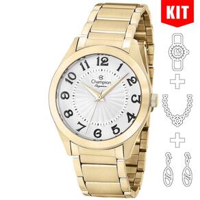 Características Formato do Relógio: Redondo Composição do Vidro: Cristal mineral Material da Caixa: Metal Cor da Caixa: Dourado Cor do mostrador: Branco Material da Pulseira: Aço Inox Cor da Pulseira: Dourado Mecanismo: Analógico Quartz