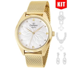 Características Formato do Relógio: Redondo Composição do Vidro: Cristal mineral Material da Caixa: Metal Cor da Caixa: Dourado Cor do mostrador: Branco Material da Pulseira: Aço Inox Cor da Pulseira: Dourado Mecanismo: Analógico Quartz