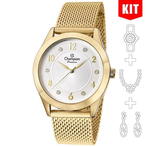 Características Formato do Relógio: Redondo Composição do Vidro: Cristal mineral Material da Caixa: Metal Cor da Caixa: Dourado Cor do mostrador: Branco Material da Pulseira: Aço Inox Cor da Pulseira: Dourado Mecanismo: Analógico Quartz