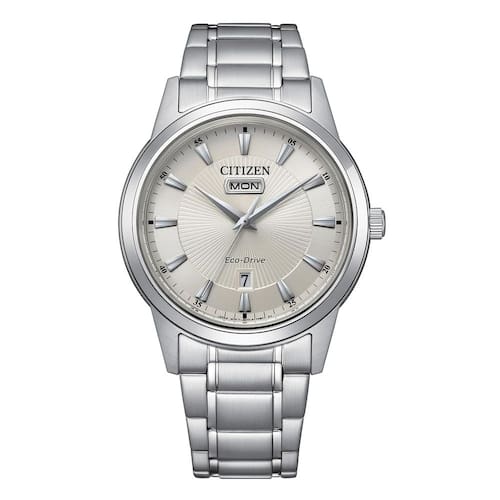 Citizen Relógio clássico masculino Eco-Drive, pulseira de aço inoxidável prateado, mostrador marfim, 3 ponteiros, dia/data (modelo: AW0100-86B)